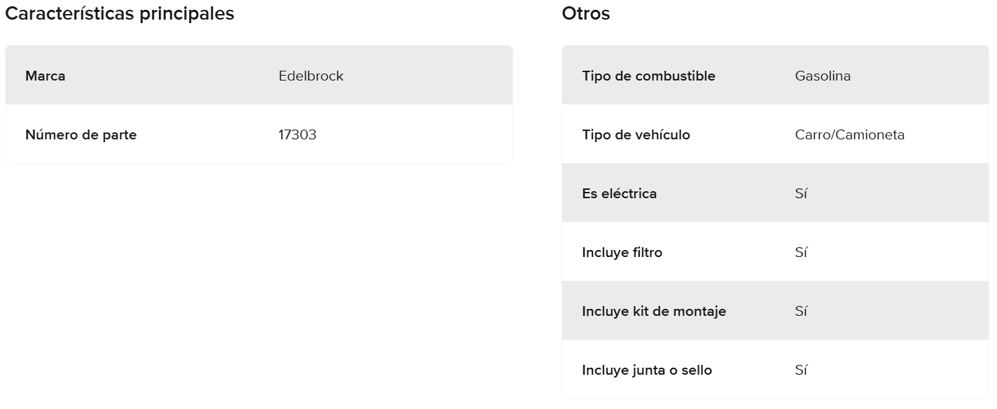 a bomba de combustible Edelbrock parte # 17303 es una bomba de tipo alimentada por gravedad con un diseño simple de 2 cables. Requiere aproximadamente un consumo promedio de un amperio en la entrega máxima y funciona solo en sistemas de tierra negativos de 12 voltios. Cuenta con un rotor de estilo en línea y un diseño de bomba de paletas. 2-3.5 PSI, 30 GPH para la mayoría de aplicaciones con carburador y es compatible con gasolina y E85. La bomba tiene conectores de lengüeta de 5/16 integrados en la salida de combustible y un conector de 5/16 en la entrada del filtro de combustible incluido.